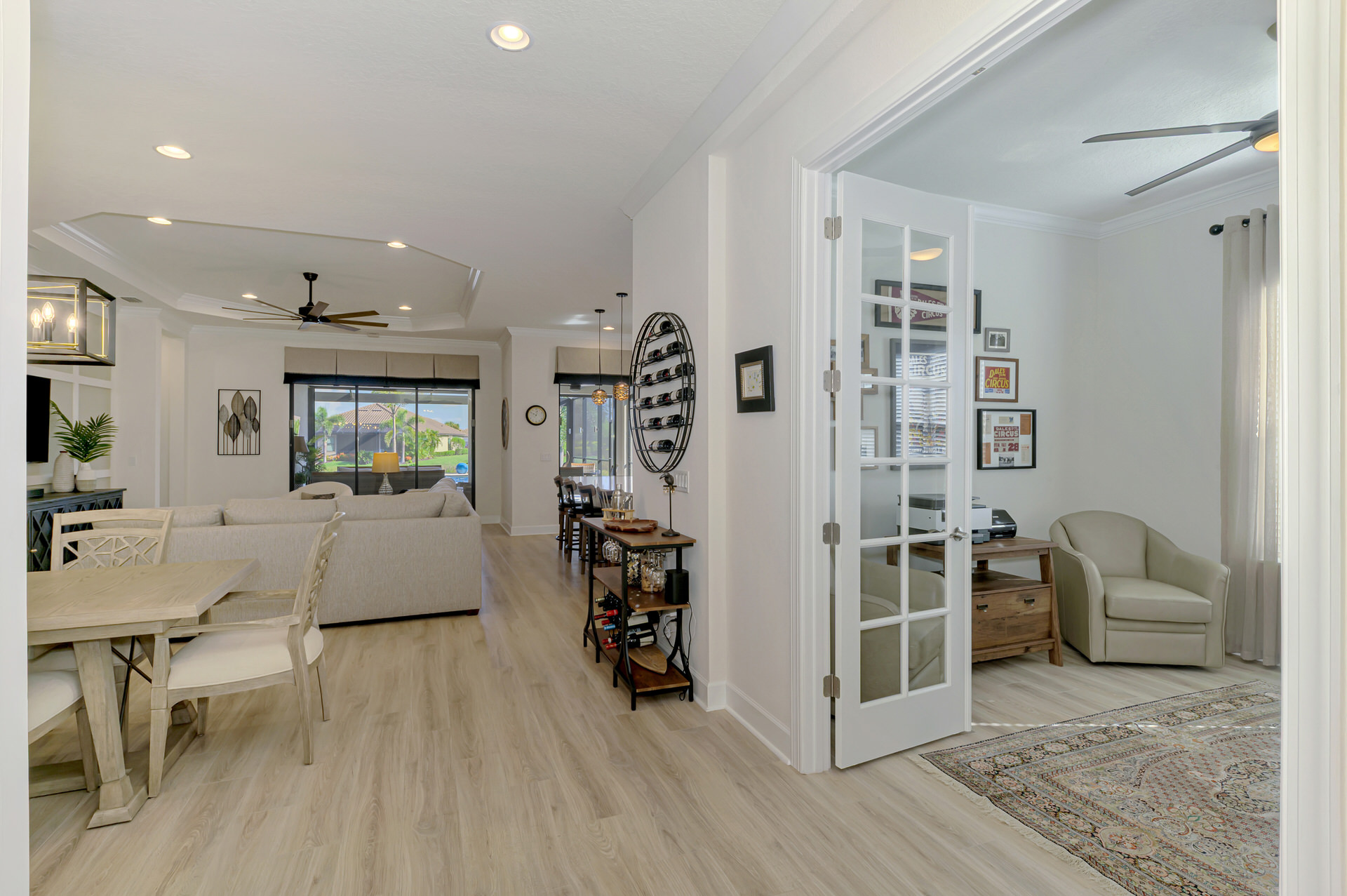 This spacious 3-bedroom, 3-bathroom home with a tandem garage was crafted with attention to detail. Hurricane-impact windows and a Storm Smart Shade provide peace of mind, while upgraded lighting, tray ceilings, and crown molding add a touch of sophistication. Beautiful laminate flooring flows throughout the home, complemented by custom cabinetry and luxurious quartz finishes.