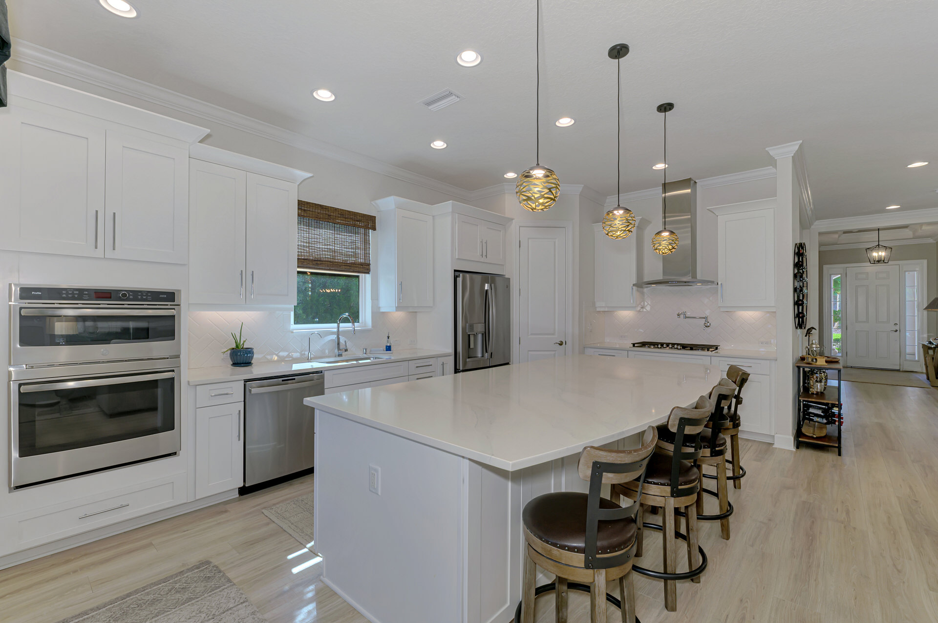 The gourmet kitchen is a chef’s dream, featuring a large island with seating, GE stainless steel appliances, gas cooking with a pot filler, soft-close drawers, deep storage, and a custom pantry. The open layout is perfect for entertaining, whether it’s casual dinners with family or hosting friends for special occasions.