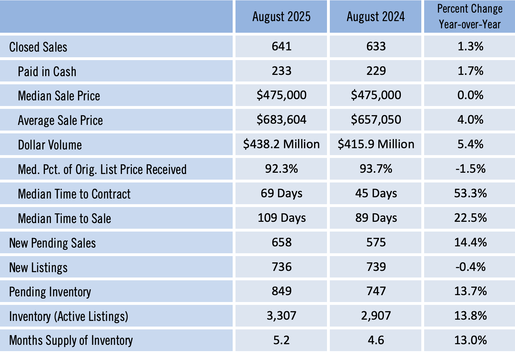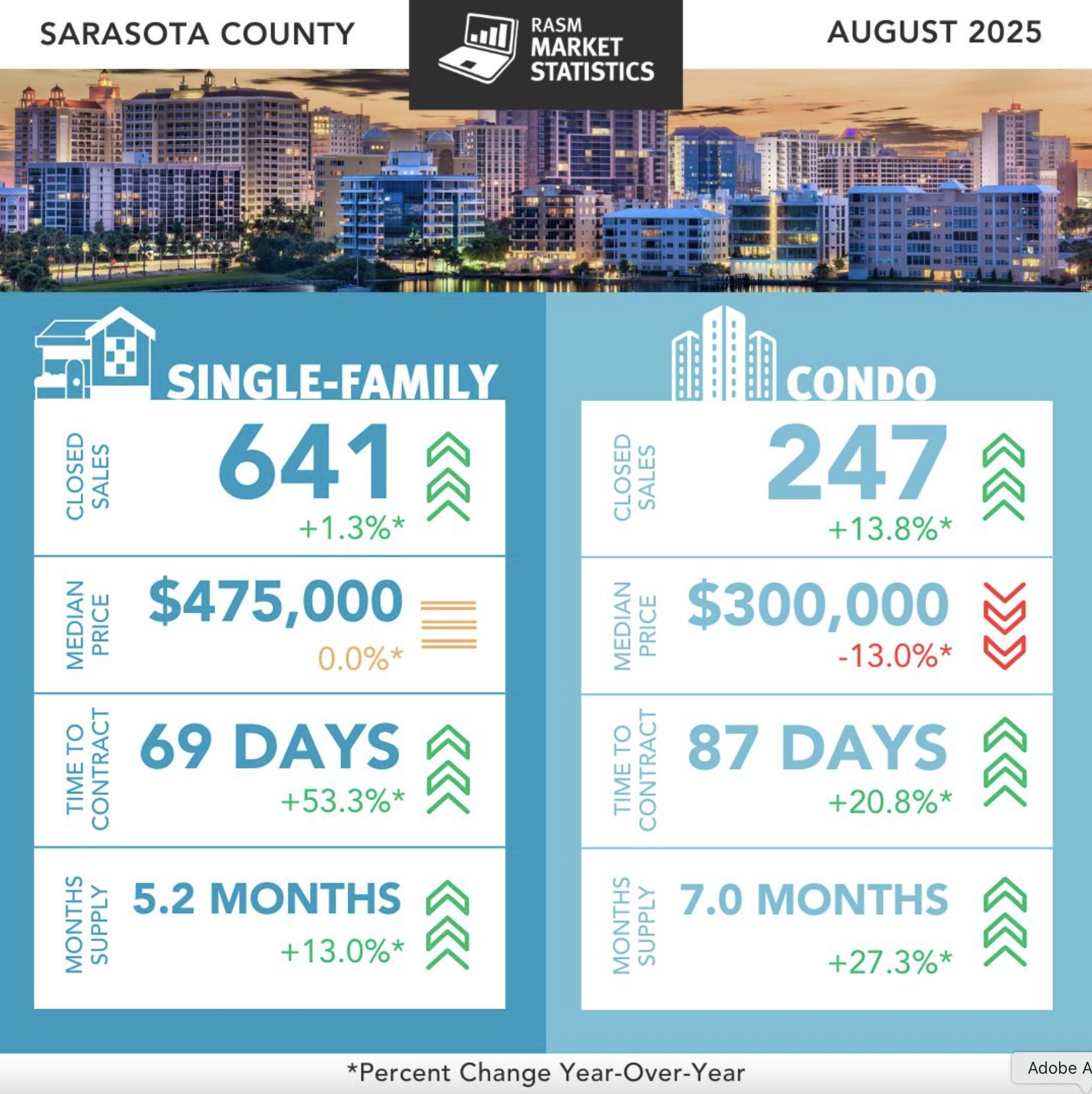 SARASOTA, Fla. (September 23, 2025) – The REALTOR® Association of Sarasota and Manatee (RASM) has released its August 2025 real estate market report, offering a comprehensive analysis of key trends across both counties. According to data from Florida REALTORS®, the August 2025 housing market in Sarasota and Manatee counties reflects a region in transition, with increasing balance between buyers and sellers.