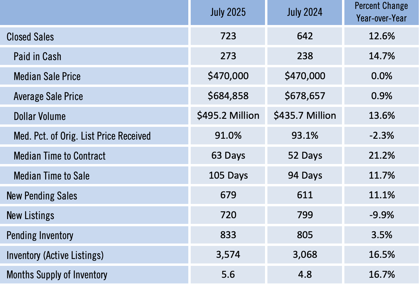 Overall, the market is cooling compared to last year but stabilizing month to month. Buyers now have greater negotiating power as homes take longer to sell and median percent of original list price received ratios dip below 95 percent, yet the slowdown in inventory growth points to a healthier balance ahead. As the region enters the second half of 2025, single-family homes are anchoring the market while condos and townhomes continue to adjust to shifting buyer demand. In this evolving market, working with a REALTOR® is essential for both buyers and sellers to navigate negotiations, pricing strategies, and inventory shifts with confidence.