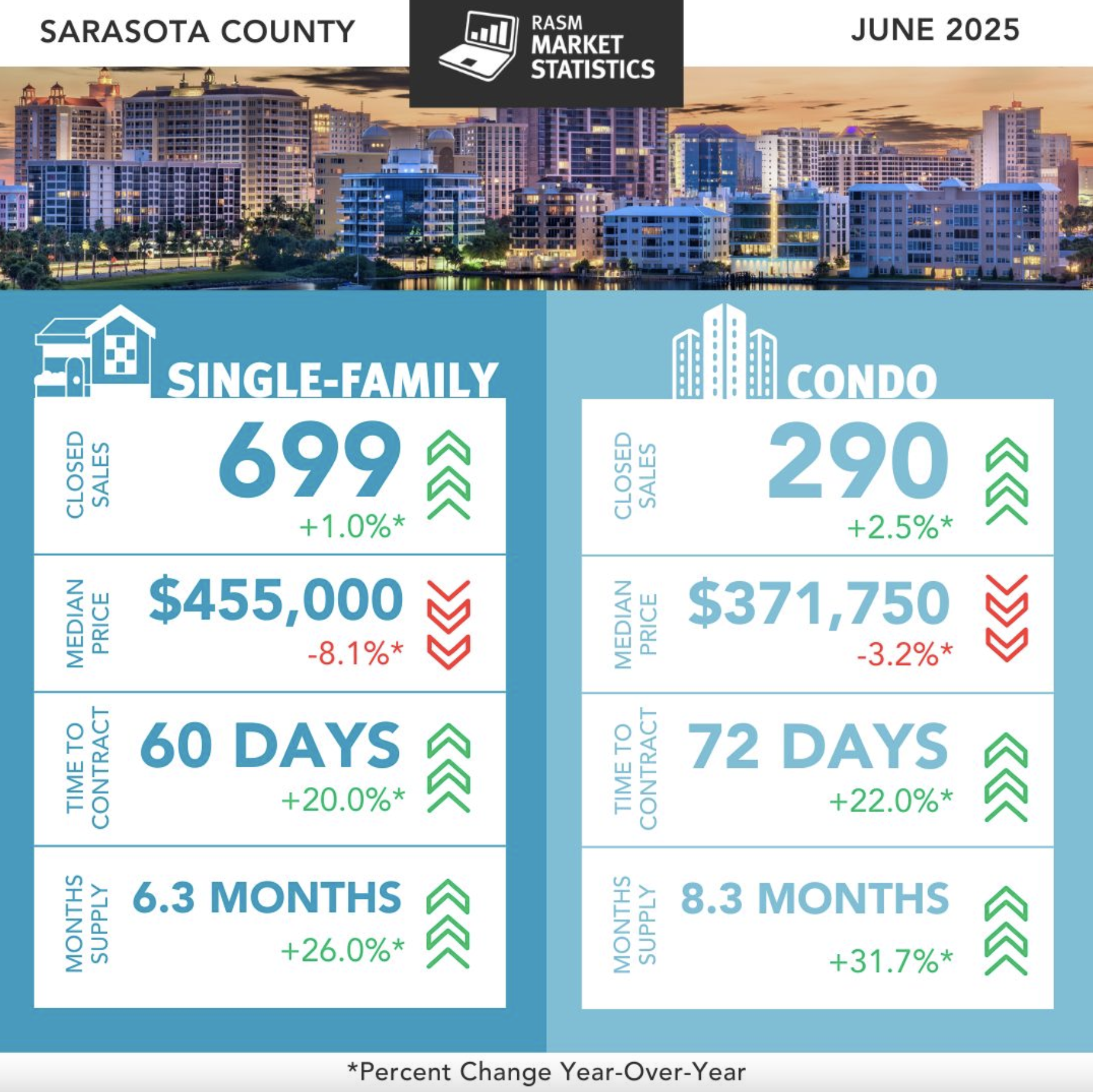 SARASOTA, Fla. (July 23, 2025) – The REALTOR® Association of Sarasota and Manatee (RASM) has released its June 2025 real estate market report, offering a comprehensive analysis of key trends across both counties. According to data from Florida REALTORS®, the housing market in Sarasota and Manatee counties continued to show signs of cooling in June 2025, with year-over-year declines in median sale prices across all property types and both counties. While closed sales remained relatively steady in Sarasota, Manatee saw modest declines, particularly in the single-family segment. Rising inventory levels and extended time on market suggest a shift toward a buyer’s market, though the months supply of inventory has begun to level out in recent months, a possible indicator of market stabilization ahead.