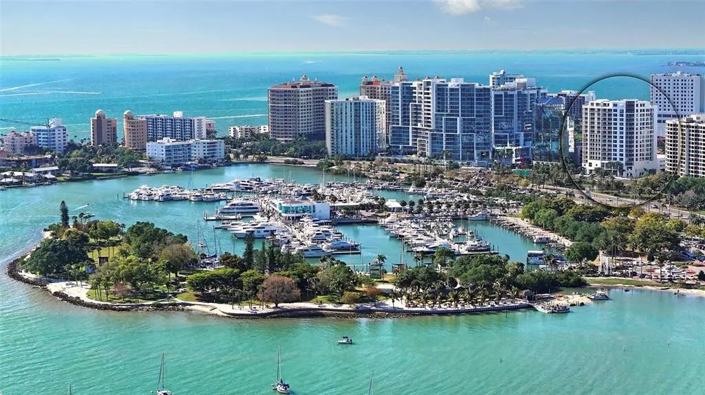 MAJOR PRICE REVISION. Marina Towers, Sarasota’s premier bayfront building is in the heart of downtown and offers 365* views of unimpeded bay, marina, gulf, and city views from this 10th floor, 5,800sf residence with an expanded terrace and high ceilings. A private elevator lobby opens into a Grand Salon featuring a gas fireplace and a wall of floor to ceiling windows overlooking the picturesque vistas. The large rooms throughout the residence with endless panoramic viewpoints make this a unique living experience. Delight in a gourmet chef's kitchen highlighted with top-of-the-line appliances including a Wolf gas range, Wolf ovens, Miele dishwasher and a Sub Zero refrigerator and a large pantry closet. A separate catering kitchen is perfect when entertaining larger groups, and spacious dining room and separate intimate dining space are ideal for family gatherings or intimate dinners. The bar area includes a handsome built-in wine cellar. A home theater and the family living areas are well-designed for everyday living. The floor plan lives like a sizable home accommodating 4-bedrooms, 3 en suite plus an oversized den/office with views for everyone. The primary suite has two large walk-in closets and a spacious bathroom. Both the primary and secondary suites overlook Sarasota Bay. Marina Tower offers the epitome of contemporary living in our vibrant bayfront city, boasting full-service amenities including 24-hour concierge and security. This is a pet-friendly, amenity-rich community featuring a chic outdoor heated pool/spa area, fitness center, and a community room with catering kitchen. Additionally, owners have access to a guest suite. This pet friendly community allows two pets with no weight limit. Clever building design allows owners to drive into the gated building, with concierge service available to assist with shopping bags and packages. Added unique features are room-size storage areas plus four secured parking spaces. Sarasota Bay’s famous sunsets and sparkling blue water as far as the eye can see with the heart of Downtown Sarasota, abundant dining, shopping, and entertainment mere steps away.