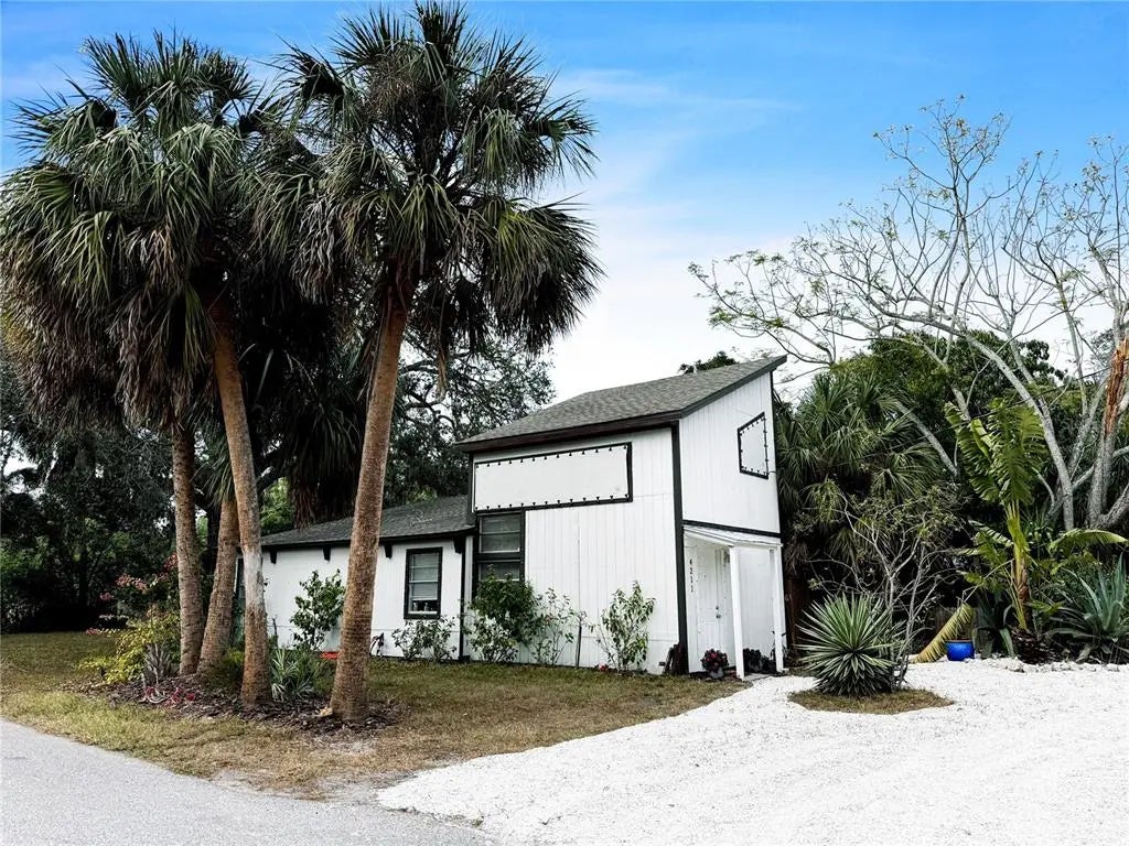 This modern home in Bayou Oaks is a unique blend of design and functionality. The interior features a vaulted wood ceiling in the living room that adds warmth and dimension, complemented by an open kitchen with clean lines and ample workspace. French doors open to a large patio surrounded by tropical gardens and a private, serene setting on almost a half acre. This home an ideal retreat for artistic pursuits and or quiet living. 3 miles to downtown Sarasota, 1.5 miles to Ringling Museum and Jungle Gardens.