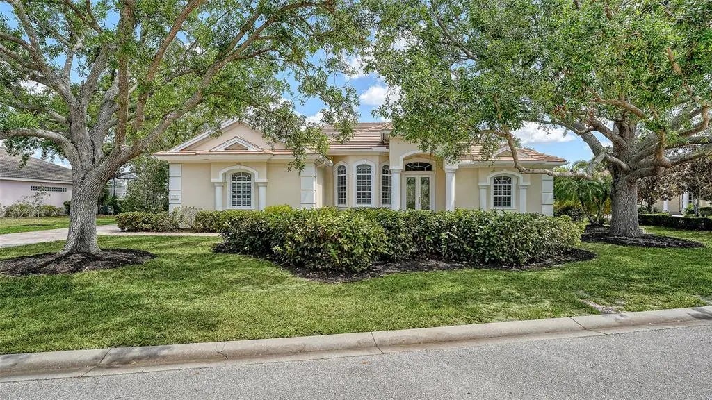 Hyde Park, an enclave of only 12 homes inside the gates of University Park Country Club where home sizes vary from 3,000-5,600 sq ft. PRICED BELOW RECENT 2025 APPRAISAL. Beautiful details inside and out. This home sits on a serene HALF-ACRE and on the water. Slow down and enjoy the drive and lush landscaping throughout the community and arrive in this scenic and charming neighborhood. This home is graced with a beautiful entry of leaded glass doors and custom details throughout. A classic floorplan with an open family room/kitchen that has been updated with timeless finishes. Side entry garage, paver driveway and paved walkway to the entry. (TILE ROOF REPLACED: 2015). Foyer opens to the living and dining room and this home is saturated in natural light with tall windows and sliding glass doors to the pool area. Flooring is 18” diagonal tile; soaring ceilings and crown moldings. A feature that sets this welcoming home apart is a floor-to-ceiling striking wall of bookcases enhanced by accent lighting. Fully equipped and well-appointed kitchen; a wet bar and a walk-in pantry. A charming breakfast nook overlooks the pool with an aquarium glass window. Split bedroom plan includes a spacious primary suite with two custom closets, a stunning renovated bathroom with dual granite vanities, walk-in shower, marble flooring, and a private water closet. Two additional bedrooms plus a versatile fourth bedroom with direct pool access can serve as an office, study or additional living space. The backyard and pool area features an expansive paver lanai, two covered seating areas and room for an outdoor kitchen (natural gas hook-up). The pool overlooks the water and the natural beauty surrounding this home is simply relaxing. Residents of University Park Country Club have access to 27 holes of championship golf, tennis and pickleball courts, state-of-the-art fitness center, walking trails, and a wide variety of social activities, all within a secure, gated community. Located just minutes from downtown Sarasota, UTC Mall, world-class shopping, dining, beaches, and SRQ International Airport, this home offers the ultimate lifestyle in one of Sarasota's most desirable communities.