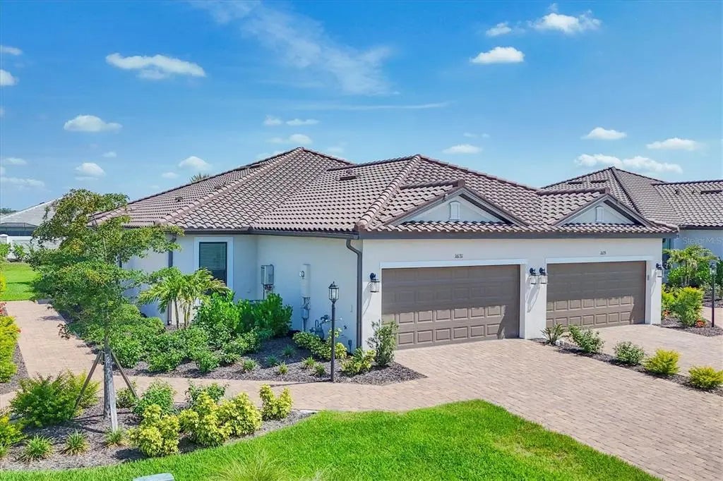 Impeccably upgraded, ideally sized 2 bedroom/2 bathroom plus office home in vibrant Azario for those seeking upscale ambiance, resort amenities and minimal maintenance in a country club setting. Nearly new and beautifully furnished (negotiable), the Ibis open-concept floor plan has a centrally located kitchen that opens effortlessly to the great room and dining room. Countertops showcase polished quartz, solid wood gray cabinetry, under-cabinet lighting and externally vented range hood. An elegant primary suite has an oversized walk-in closet, dual-sink vanity, shower stall and water closet. At front of the home is a private guest suite with attached bath and a versatile den/office/flex space with pocket doors. Thoughtfully accentuated with tray ceilings, crown molding, 8-foot doorways, upgraded lighting package and designer fixtures. Motorized blinds provide sun control and privacy across great room's triple sliders and owner's bedroom suite windows. Extended screened lanai offers breezy landscaped views. Large laundry room with upper/lower cabinetry, utility sink, smart home technology, surround sound and epoxy-coated two-car garage. Azario offers 18-hole golf course, aqua driving range, heated beach-entry pool with cabanas, hot tub, state-of-the-art fitness center and classes. The Venue has billiards, ping-pong, cards and clubs. Full service poolside tiki bar, culinary center with cafe, fine dining, upscale lounge, patio eats, cafe, teaching kitchen and wine tastings.