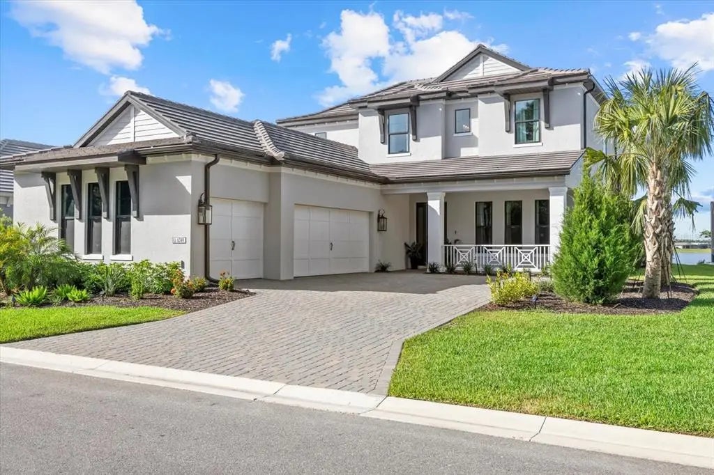 Experience refined coastal living in this exquisite West Indies-style home, perfectly positioned on one of the largest waterfront lots in The Alcove at Waterside. Custom built by Neal Signature Homes in 2024, this practically new 3,404 sq ft residence offers sweeping views of Blue Heron Lake, elevated interior design, and unforgettable sunsets. From the moment you enter, you're greeted by panoramic lake views that provide a stunning backdrop throughout the main living areas. Rich wood-look flooring flows across the first floor, accentuating the home’s clean architectural lines, elegant crown molding, tray ceilings, and curated designer finishes. At the heart of the home is a chef’s dream kitchen, ideal for entertaining. It features a striking waterfall island with seating, a gas cooktop, double ovens, a spacious walk-in pantry, and dual-toned cabinetry. The open-concept layout blends the kitchen, dining, and family rooms into a seamless space for harmonious living. Step outside into your private backyard oasis complete with a heated pool and spa, upgraded pavers, and a panoramic screened lanai—perfect for relaxing and entertaining year-round. Also on the first floor is an expansive bedroom with a walk-in closet and private en-suite bath—an ideal space that could effortlessly function as a secondary primary bedroom. This level also features a refined den or office, an elegant powder bath, and a thoughtfully designed mudroom for everyday convenience. Upstairs, the primary suite offers a true retreat, complete with dual sink vanities, a spa-inspired smart shower, and expansive his-and-hers walk-in closets. The second level also features two additional bedrooms, a full bath, a spacious bonus room, and a generously sized laundry room for added ease and efficiency. Other notable features of this all-encompassing 4,952 square foot home include: hurricane – grade impact windows and sliders, alarm system with camera, and a three-car garage with epoxy flooring. Residents of The Alcove at Waterside enjoy a boutique community of just 47 lakeside homes, with access to a private kayak launch on Blue Heron Lake. Located in Lakewood Ranch’s sought-after Waterside District, you’re moments from Waterside Place’s dining and shopping, and the vibrant events and recreation at Waterside Park. HOA includes full landscaping for a maintenance-free lifestyle.