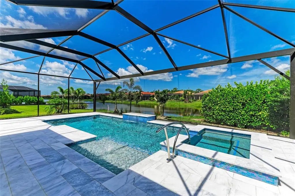 Discover the ultimate in waterfront living with this nearly new Wheaton floor plan, perfectly positioned on a desirable corner lot. This beautiful home features a brand-new luxury heated saltwater pool and a large spa, complemented by a travertine deck and a view screen, all enjoying western exposure for breathtaking Florida sunsets. The Wheaton floor plan is popular for a reason, offering an open layout that includes a great room, dining room, three spacious bedrooms, a large den, three full baths, two powder rooms (one as the pool bath!), and a generous three-car garage. Notable features include wood-look plank tile flooring throughout (no carpets here), plantation shutters, white cabinets, quartz countertops, a designer backsplash, custom closets and pantry, and designer two-tone paint reminiscent of the Florida sky. The expansive covered lanai is perfect for al fresco dining, overlooking both the pool and a serene lake while taking in stunning sunsets. Live life to the fullest year-round in Toscana Isles, a gated, resort-style, maintenance-free community designed for an active lifestyle. Engage in kayaking, canoeing, and fishing on over 200 acres of interconnected lakes right from your backyard. The 8,000-square-foot clubhouse offers a fitness center, ballroom, billiard room with a big-screen TV, and more. Toscana Isles is conveniently located just six miles from the beautiful Nokomis Beach (a mere 10-minute drive), as well as the Legacy Bike Trail and the vibrant downtown areas of Venice and Sarasota, which are rich in culture and offer exceptional shopping and gourmet dining options. Additionally, Sarasota Memorial Hospital has recently opened its new Venice campus nearby. Don't wait, call today to schedule your private showing and make this dream home yours!