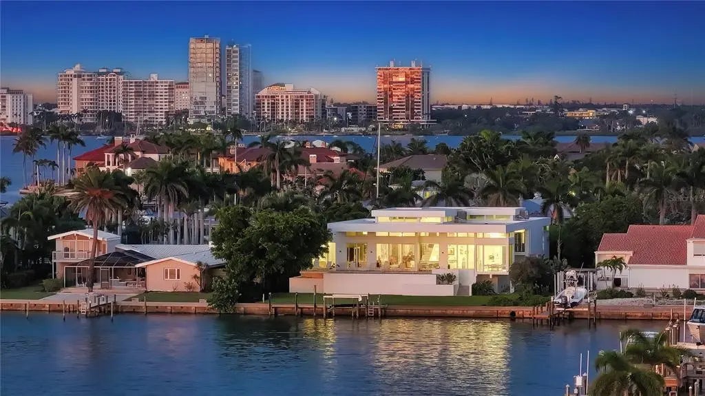 Located on the pristine shores of Sarasota Bay, this striking contemporary Bird Key residence offers a seamless fusion of bold architectural design and elevated coastal living. Designed by renowned architect Jonathan Parks and completed in 2014, the home spans over 4,100 square feet across two living levels. Every inch reflects a refined aesthetic, with soaring ceilings, luminous marble floors, and expansive walls of glass that frame breathtaking water views and spectacular sunsets. A circular driveway introduces the home, guiding you through manicured landscaping to a dramatic marble and glass-framed foyer. Once inside, the open-concept layout unfolds in impressive fashion. The expansive living/dining room is anchored by 20-foot ceilings and clerestory windows that flood the space with natural light, while sliding glass doors blur the line between indoors and out. Perfectly suited for entertaining or everyday living, the main living area flows effortlessly into a show-stopping kitchen equipped with sleek custom cabinetry, a waterfall-edge island, gas Wolf range, walk-in pantry, built-in planning desk, and wet bar. The main-level primary suite is a tranquil retreat, featuring dual walk-in closets, separate en-suite bathrooms for him and her, and a private study offering a quiet place to relax. Upstairs, a spacious loft functions beautifully as a game room, media lounge, or additional workspace, while two well-appointed guest suites offer walk-in closets and private balcony access overlooking the surrounding treetops and waterway. Outdoors, the setting is equally remarkable. With 100 feet of direct bay frontage, the backyard invites endless possibilities for recreation. A long lawn is bordered by a flowing fountain feature, offering the perfect canvas for creating your own resort-style pool and al fresco entertaining space. Boating enthusiasts will appreciate the deep-water dock equipped with a 10,000-pound lift, allowing for easy, unobstructed access to Sarasota Bay and the Gulf of Mexico beyond. Situated on the exclusive barrier island of Bird Key, this modern residence places you just minutes from Sarasota’s vibrant downtown, the fine dining and upscale boutiques of St. Armands Circle, and the immaculate Gulf sands of Lido, Longboat Key, and Siesta Key beaches. Cultural venues like the Ringling Museum and Sarasota Opera are nearby, along with premier yacht clubs and marinas. Offering a rare blend of modern design, waterfront serenity, and proximity to the region’s finest amenities, this home captures the very essence of an oceanside luxury lifestyle.