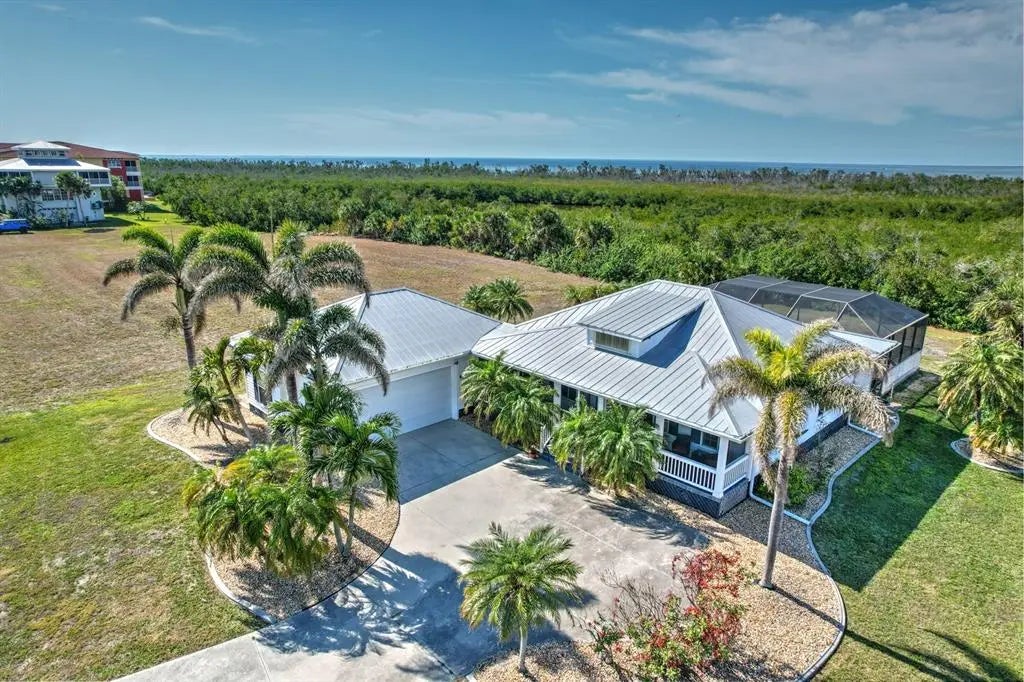 LOOK AT THE PRICE for this charming Key West style home with great curb appeal is situated on a larger half acre lot in the quiet section of Burnt Store Lakes! Ready to downsize and reduce your expenses? You won’t find another home like this. First you’ll notice a long-wearing metal roof that provides a deep overhang with an attractive wide screened front porch. Watch beautiful sunrises while enjoying your morning coffee and then watch the stunning sunsets in the evening out back. This home is well-protected by the natural mangrove buffer in back and had no water or wind damage from recent storms. Hurricane shutters offer additional protection when needed. Easy maintenance vinyl clapboard siding covers the block construction for a true coastal look. Inside a 2 bed/2 bath + den/office open layout brings in loads of natural light throughout the day from windows all the way around. The inviting living and dining room greet you from the entry hall. Crown molding adds crisp detail to the ceilings and stunning new bamboo flooring installed in 2024 creates a warm and intimate ambiance throughout. The desirable split floorplan provides privacy for you and guests and the current owners added the office/den for an additional sleeping area when visitors come. A delightful owner’s bedroom has a stylish barn door to enclose the ensuite bath that features a granite counter, newer cabinets, 2 sinks, shower and walk-in closet. Across the home a spacious open kitchen has loads of space for meal prep with long granite counters, tile backsplash, shaker-style cabinets, new stainless appliances and extra storage below the breakfast bar. A stacked washer and dryer are conveniently located behind bi-fold doors. Open wide the French Doors that lead to the pool area and relax on a pavered pool deck with newer pool cage and a sparkling waterfall pool with loads of privacy. At 22sf x 35sf, the attached side-load garage is larger than it appears so you have more space for cars and toys. And the 1/2 ACRE VACANT LOT TO THE RIGHT IS AVAILABLE for future expansion or more privacy! Have a peaceful lifestyle at the western end of Burnt Store Lakes – a community with city water and sewer, beautiful custom homes and a desirable location right next to Burnt Store Marina. You won’t want to miss this!