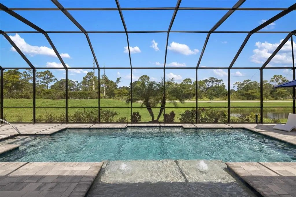 The primary suite offers a serene retreat with a spacious seating area, a well-appointed walk-in closet with custom built-ins, and a luxurious en-suite bath featuring a deep soaking tub and Roman-style walk-in shower. Bedroom #4 offers flexibility as a home office, study, or creative space, and the dedicated pool bath is perfectly positioned for guests enjoying the outdoors. Outside, unwind beneath the impressive 10.5-foot-tall pool enclosure, built with top-tier materials for durability and clear pond views. With a rear western exposure, the home is perfectly positioned to enjoy breathtaking Florida sunsets from the privacy of your heated saltwater pool and sun shelf. Whether hosting guests or savoring a quiet evening, the setting is nothing short of spectacular.