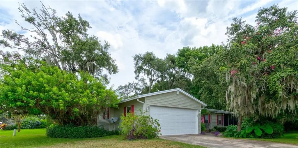 Welcome to Lighthouse Cove, a gated golf-cart friendly community nestled in the charming town of Oak Hill, Florida. This beautifully maintained 3- bedroom 2-bath home sits on a lush corner lot surrounded by mature trees and native greenery. Relax and enjoy morning coffee or cool evenings on the furnished side porch with a spacious 14x8 storage room, an added bonus for your holiday decor, hobbies or beach toys. Inside, the open floor plan is filled with natural light from large windows and a skylight. The kitchen features newer luxury vinyl plank flooring, updated appliances, a stylish new faucet, and a central island offering extra counter space and storage, perfect for meal prep and entertaining. The cozy, inviting family room could make a perfect sports watching area, as well as listening for frogs singing after a rain, or owls hooting from the dedicated green space. The sunny living room with its vaulted ceilings and huge triple windows is your go-to space for relaxing with a good book and a refreshing drink. The primary suite easily accommodates a king sized bed and includes a spa-like
