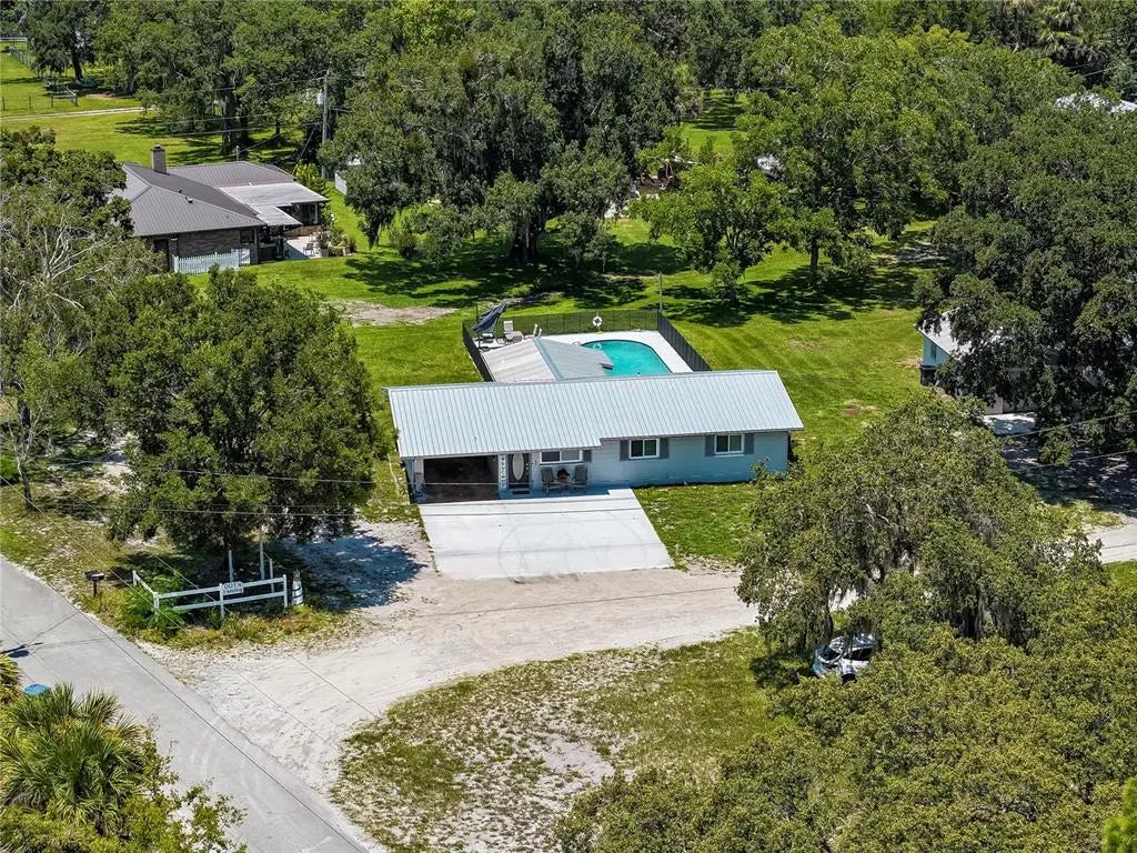 Welcome to your private Florida retreat! This beautifully updated 3-bedroom, 2-bath home sits on a full acre with a sparkling resurfaced pool and a view of a neighboring sweet little pond and gazebo; the perfect backdrop for outdoor living. Inside, the open floor plan showcases all-new luxury vinyl plank flooring, fresh paint, resurfaced walls and ceilings with a modern orange peel finish, and abundant natural light through impact-rated windows with new blinds throughout. The 2024 kitchen renovation features stunning quartz countertops, updated cabinetry, and new appliances, while the new French doors open to the pool and patio for seamless indoor-outdoor entertaining. Recent upgrades include a 2021 metal roof, 2024 AC and new ductwork, Culligan whole-home chlorinated water system, new septic with dosing tank, and a brand-new electrical panel — giving buyers peace of mind for years to come. Enjoy Florida living with a safety-fenced pool, new equipment, a one-car garage plus carport, and a crushed concrete driveway connecting to a county-maintained road. Smart home features like cameras and locks add convenience and security. For fishing enthusiasts, there is a deep sink stainless steel fish cleaning station with running water located on the outside of the garage. This property offers the rare combination of modern upgrades, spacious outdoor amenities, and natural charm — just minutes from the Florida Intracoastal, Mosquito Lagoon, and beautiful Volusia County Beaches! Key Features 3 bedrooms, 2 bathrooms on 1-acre lot Large resurfaced pool with new equipment & safety fence 2021 metal roof, 2024 AC & ducting Quartz countertops, new laminate flooring, fresh paint New impact-rated windows & French doors New septic system with dosing tank Smart home cameras & locks Culligan water system (whole home, chlorinated) 1-car garage + carport, crushed concrete driveway