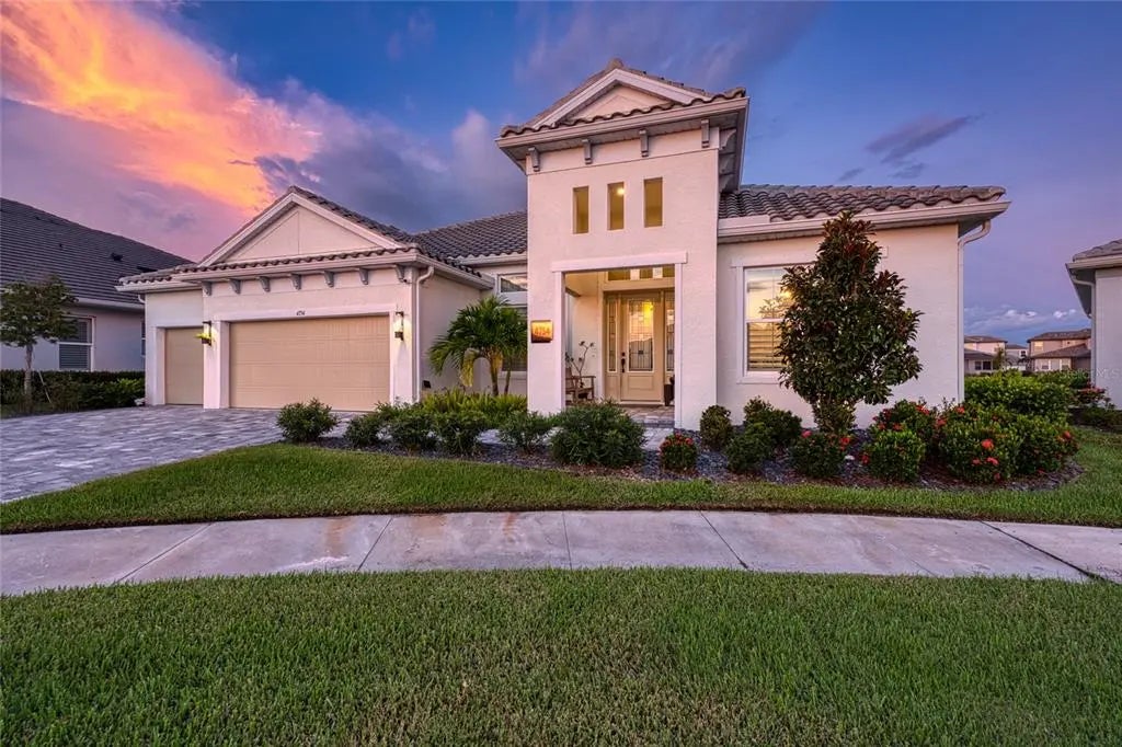 Discover luxury with this exceptional waterfront residence, meticulously designed with an emphasis on harmony and luxury. This sprawling 4 bedroom, 3 bathroom, lap-pool home encompasses 3,308 square feet of living space on a premium lot giving you a 180-degree panoramic water views and situated in a serene cul-de-sac. Property was built with the highest level of upgrades available through the builder. The striking curb appeal invites you in, showcasing a paver driveway, a covered entryway, a tile roof, and meticulously manicured landscaping. Upon entering, you will be captivated by the luxury upgrades, timeless architectural details, volume ceilings, abundant natural light, and Italian wood-look tile that flows throughout the home. The floor plan and design are truly showcased with a refined sense of elegance and functionality with every detail thoughtfully planned with timeless luxury and comfort in mind. Impressive dining room features a coffered ceiling, modern lighting, and custom wall accents, setting the stage for memorable gatherings. Enjoy the expansive living room seamlessly connects to the kitchen, offering views of the water and pool area. The Chef’s kitchen is a true highlight, complete with quartz and Cambria countertops, ceiling-height cabinetry, stainless steel appliances including a built-in oven, gas cooktop, and pantry plus butler’s station for optimal organization. Enjoy casual meals in the dinette or at the breakfast bar, adorned with contemporary lighting. The versatile bonus rm can serve as a family rm or any additional space you envision. French doors lead to an office/den, providing an ideal setting for work or study. Retreat to the spacious primary bedrm, which boasts direct access to the lanai and large picture windows that invite natural light. The spa-like ensuite bathrm features a freestanding garden tub, dual vanities, upgraded glass-enclosed shower with two shower heads, and two custom walk-in closets. Three additional generously-sized bedrooms offer ample space. Quality plantation shutters are custom made, pure linen curtains will capture your attention. The laundry room is equipped with quartz countertops, cabinetry, and a deep sink, plus there is a custom mudroom-style organizer in the garage. Step outside to your outdoor oasis, which optimally integrates indoor and outdoor living. The covered patio is perfect for lounging and includes rough-ins for an outdoor kitchen. Dive into the inviting saltwater lap pool or unwind in the spa. The upgraded, fully screened enclosure offers an open-unobstructed views of the water. The pool is positioned to obtain a full day of natural light reducing your need for heating. Additional features include smart home technology, security system, seamless gutters, home water softener system, generator rough-in ready, upgraded insulation for energy efficiency, and epoxy flooring in the garage. Located in the gated community of Worthington with low HOA fees and no CDD, residents can enjoy a scenic shell walking trail that winds through the neighborhood. This home is conveniently situated near downtown Sarasota, I-75, Tampa, St. Petersburg, the UTC shopping district, and the breathtaking beaches of Siesta Key, Lido Key, Longboat Key, and Anna Maria Island. This is a rare opportunity to own a lakefront sanctuary that beautifully blends luxury, design, and Feng Shui harmony. Designed with elemental balance, symbolic energy flow and Feng Shui, truly a one of a kind home.