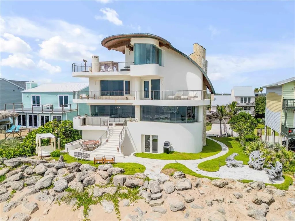 || The White Coral – Oceanfront Estate - Curated Furnishings || Welcome to The White Coral, a one-of-a-kind four-level architectural masterpiece perched directly on the pristine sands of New Smyrna Beach. This striking oceanfront estate blends sculptural design with effortless livability, creating a rare sanctuary where every sunrise and sunset feels like a private work of art. From the moment you arrive, the residence commands attention with its bold coastal architecture, curving balconies, and natural finishes. A private elevator and a soaring travertine spiral staircase link all four levels, offering both convenience and drama. Walls of glass invite panoramic Atlantic views into nearly every room, while vaulted ceilings and open layouts create a sense of light, volume, and ease. | Indoor–Outdoor Living & Entertaining | Designed for gathering and entertaining, The White Coral offers a seamless flow between its expansive interiors and multiple oceanfront terraces. The rooftop deck sets the stage for unforgettable evenings—cocktails at the built-in bar, conversations around the fire feature, or stargazing with the rhythm of the waves below. Spacious lounge areas and wraparound seating are positioned to frame the horizon, whether you’re hosting intimate dinners or large celebrations. Inside, the main living space is anchored by a dramatic stone fireplace and custom curved seating designed to embrace the view. The gourmet kitchen, encased in glass, allows ocean vistas to accompany every meal, with adjacent dining spaces crafted for both elegance and comfort. Multiple wet bars and lounges are tucked throughout the home, ensuring every floor offers a destination of its own. | Private Retreats | With guest accommodations spread across the lower levels and a grand primary suite above, privacy is effortless. The primary suite is a retreat within itself, featuring a stone fireplace, floor-to-ceiling windows overlooking the ocean, and a spa-style bath with dual vanities, a soaking tub, and walk-in shower. Additional bedrooms are equally inviting, designed with refined simplicity and comfort in mind—perfect for family, guests, or staff. | Lifestyle & Leisure | Every corner of The White Coral was designed to elevate daily living. Outdoor lounges flow onto deeded beach access, where cabanas and loungers invite you to linger by the surf. Approved plans and permits for a custom-designed pool allow guests to expand the property’s resort-quality lifestyle even further. Whether you’re savoring a chef-prepared dinner, enjoying cocktails from one of the bespoke bars, or hosting an oceanside celebration, the estate offers endless opportunities for luxury living. | The Location | Positioned along a coveted, less-traveled stretch of South Atlantic Avenue, The White Coral combines rare elevation, direct beach access, and total privacy with proximity to the charm of Flagler Avenue. Here, boutique shopping, fine dining, and Florida’s most beloved surf spots are only minutes away. The absence of HOA restrictions ensures complete freedom of lifestyle, while the quiet setting preserves tranquility. | A True Rarity | This is the only known four-level single-family residence on New Smyrna Beach to feature both a full-height sculptural staircase and a private elevator. Blending bold architectural expression with long-term functionality, The White Coral is more than just a home - it's an icon. || Experience the most refined oceanfront living. The White Coral awaits ||