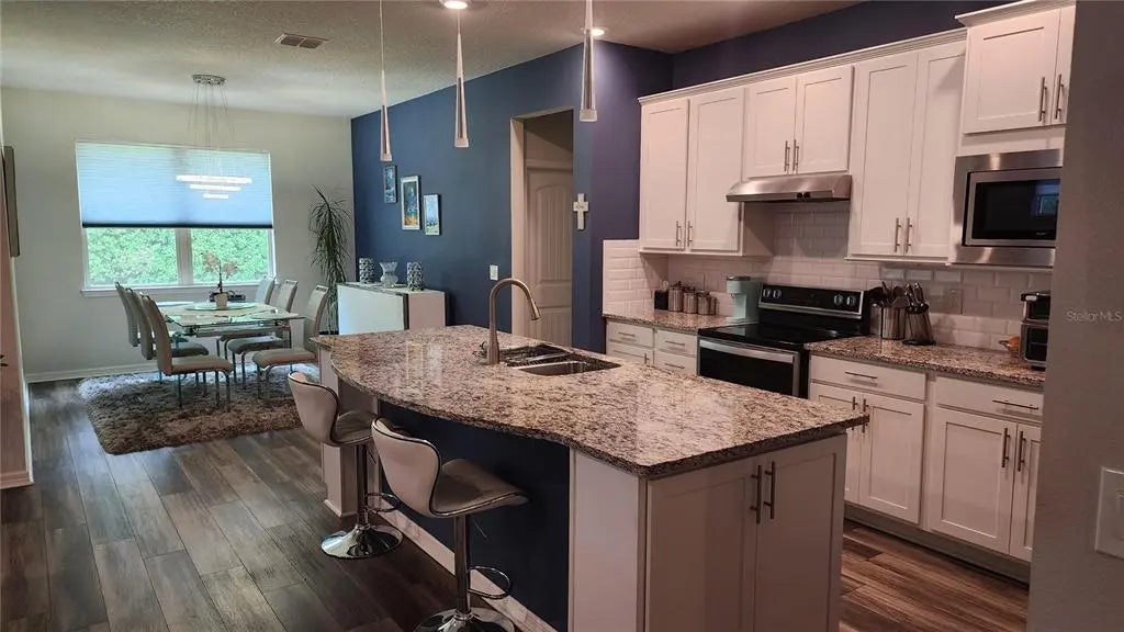 Beautiful Del Webb Stone Creek Community. A wonderful 3/2 home with 3 car tandem garage. Premium, private lot with no neighbors behind you. Insulated concrete block with insulation for added security. Very energy efficient and strong. Home is beautifully updated with granite counters in kitchen and bath. Gorgeous updated 42" cabinets with sliding drawers for easy access to pots and pans. Updated contemporary lighting and fans throughout the home. Updated Luxury Vinyl Plank floors throughout home, except bedrooms. Brand new luxury carpet in Master Bedroom. Three panel sliding stackable glass door that opens to the screened in lanai, for bug free relaxing. It's like adding a whole new room to the home which brings the outdoors in! Brand new luxury carpet in Master Bedroom. Screened in front porch with gorgeous welcoming glass insert in front door. All this in a wonderful active community! Will sell FULLY furnished in SEPARATE sale. Stone Creek has a 24/7 staffed gated entrance, for your peace and security. Luxury amenities include heated indoor and outdoor pools, a state of the art fitness center, hot tubs, sauna and spa. Stone Creeks boasts an onsite staff with activities which include tennis, pickleball, bocce, a softball field, garden and more. We have a beautifully maintained golf course with pro shop, and an on-site restaurant. This home is in a desirable neighborhood, which offers proximity to local amenities and attractions. Don't miss this one.