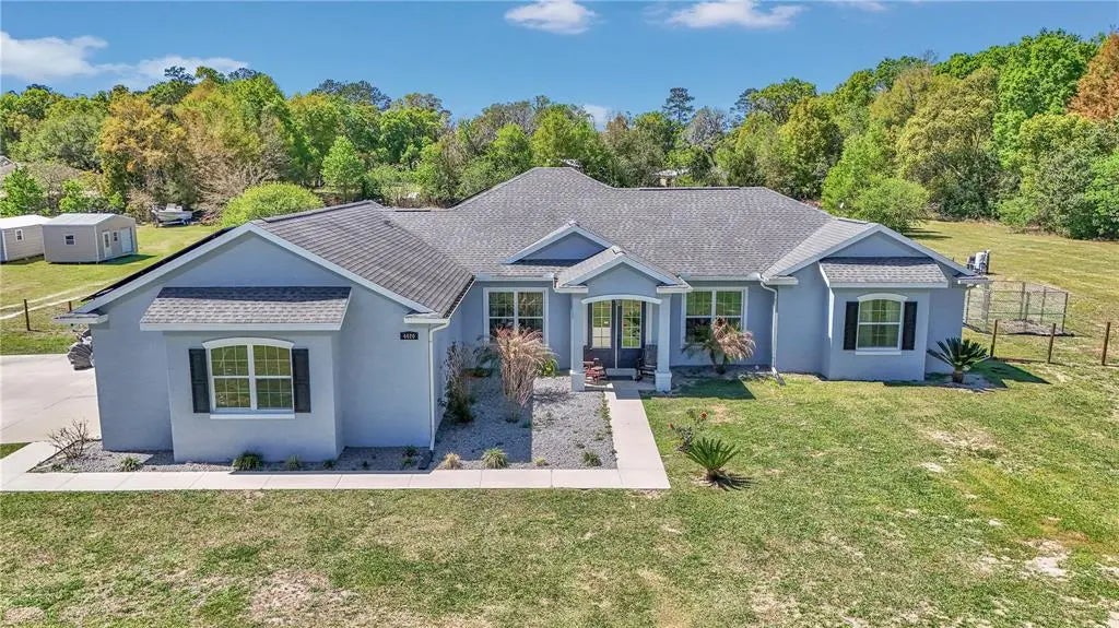 Exquisite 5+ Acre Estate with Heated Pool, Mother-in-Law Suite & Modern Amenities – Minutes from Downtown Ocala! Discover the perfect combination of luxury, space, and convenience in this breathtaking 2,400+ SqFt home. This meticulously maintained estate offers everything you need for refined country living with modern comforts. Experience an expansive open-concept living, dining, and kitchen area with soaring 10-foot crown molded ceilings, creating a bright and airy atmosphere. This custom design offers both elegance and functionality, perfect for entertaining or everyday luxury. A modern chef’s kitchen at its heart, a grand sit-in island serves as both a stylish centerpiece and a practical workspace, featuring cabinet storage underneath—perfect for keeping cookware, appliances, and pantry essentials neatly tucked away. The sleek marble countertops add a touch of sophistication, their smooth veining complementing the high-end finishes throughout the space. For those who love to cook, the double built-in wall ovens allow the convenience of preparing multiple dishes at once, making meal prep effortless for family dinners or large gatherings. The home also includes a built-in speaker and surround sound system, allowing you to enjoy high-quality audio throughout the space.