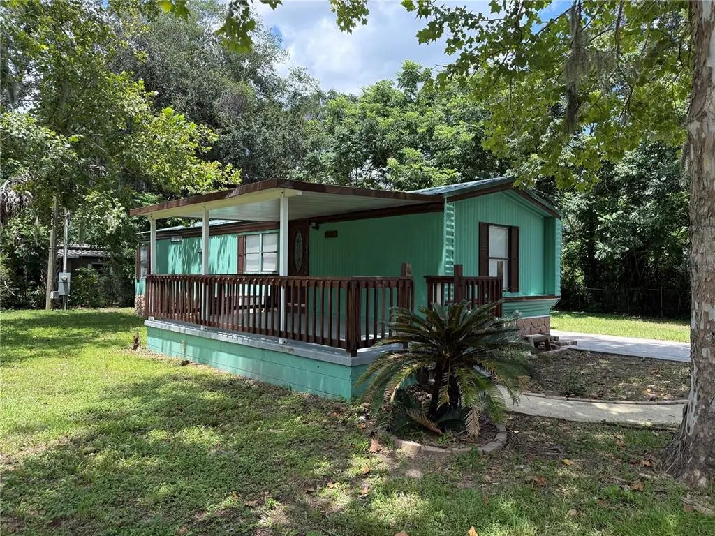 Welcome to this beautifully updated mobile home, ideally set on a .20-acre corner lot backing up a wooded space for added privacy. Located at a short drive from I-75, Downtown Ocala, WEC, grocery shopping and restaurants for convenient accessibility. The GOLDEN HOLIDAY MHP is known for its family-friendly environment and peaceful community. Step into a bright and inviting living room seamlessly connecting with the well-appointed kitchen, ideal for family gathering and tasteful meals around the breakfast nook. The Bedrooms offer generous space for a King bed or 2 twin beds (as shown in the pictures). A dedicated laundry room makes chores simple and efficient, while the attached carport provides covered parking and easy access. Grab your favorite cup and relax at the spacious front porch while enjoying the Florida weather. The included utility shed provides extra storage for your toys and gears. This move-in ready property comes with furniture, metal roof, and laminate flooring for easy maintenance. No lot rent, No HOA, No lease restrictions. Scheduled your showing today and say hello to your new home!