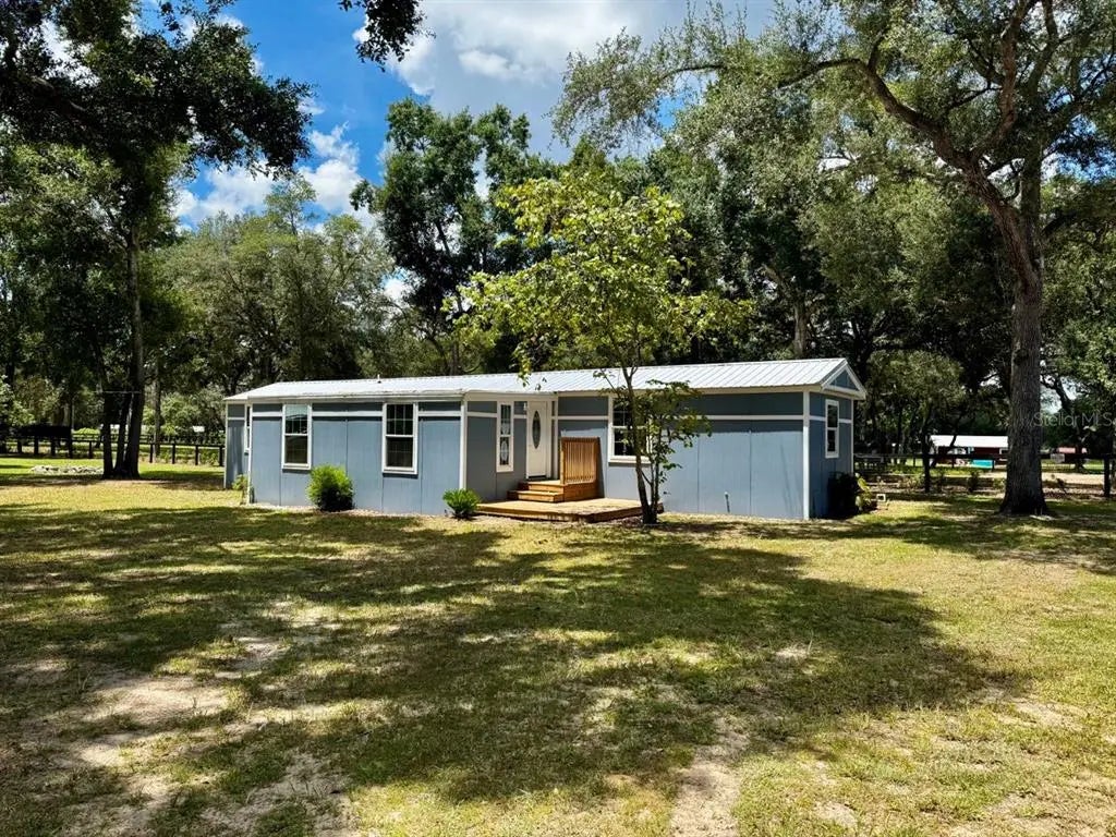 Find yourself at home, steps away from the Forest’s edge, in this beautifully renovated mobile home with a living room addition. This 3/2 home has been updated, inside and out. Improvements include a new metal roof, Hardiboard vertical siding, new drywall, insulation, and subfloor. Has new LVP flooring throughout, new doors, new double-paned windows, brand-new stainless appliances, butcher block countertops, LED recessed lighting, tiled showers, a tankless water heater, and a brand-new HVAC system. Has 2 detached storage buildings with new metal roofs, W/S/P connections, on its separate 50-amp breaker, if you should choose to reconnect. Enjoy the FL summer evenings on your deck, drinking your favorite beverage, with the occasional tune of the neighboring donkey family. Property has 200amp service with new breakers, and most wiring to home has been replaced. A loquat, citrus, and cattley guava tree are found on the property, and all mature trees have been trimmed back. Located in Salt Springs, just minutes away from multiple boat ramps to lakes, rivers, and springs, and miles of hiking/atv trails to explore through the Ocala National Forest. MOVE IN READY!