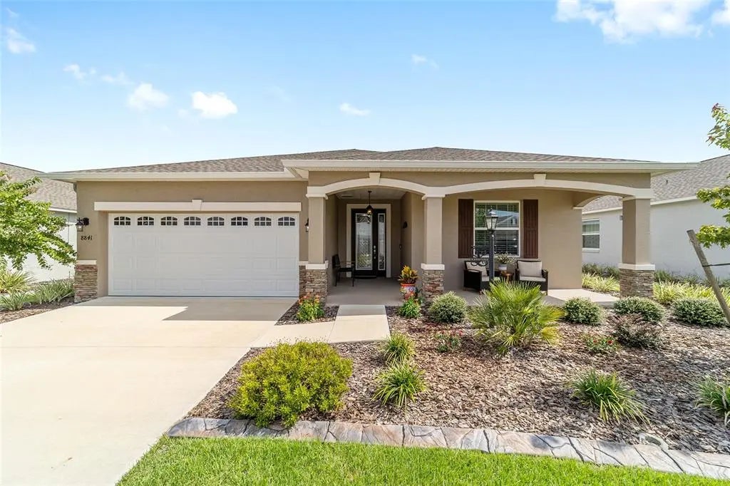Step inside this stunning Ginger model that shows better than a model home! Featuring 2 bedrooms, 2 bathrooms, a versatile flex room, and a 2-car garage, this home is filled with thoughtful upgrades and custom finishes throughout. The sophisticated kitchen is a true showpiece with staggered light gray cabinets featuring dovetail construction and soft-close drawers, a designer two-tone island overlooking the great room, granite counters, stainless steel appliances including an upgraded quiet dishwasher, and a classic subway tile backsplash. The great room, which features a tray ceiling, and flex room have crown molding and specialty millwork for an elegant, custom look. Coordinating gray tile runs seamlessly throughout the main living areas, with plush carpet in the bedrooms for comfort. The luxurious ensuite primary bathroom offers a walk-in shower with tile set on the diagonal, designer mirrors framed by shiplap, and dual vanities. Outdoor living is just as impressive with a screened lanai overlooking a private lot, plus a large free-form paver patio—perfect for entertaining or relaxing. The exterior stands out with stone elevation, poured concrete landscape beds, and outstanding curb appeal. Additional upgrades include a water softener for added comfort and convenience. Furniture may be purchased outside of the sale. Amenities at Weybourne include curbside waste collection, miniature golf, pickleball, swimming pool, fitness center, and clubhouse and for an annual fee, the On Top of the World amenities can be added.