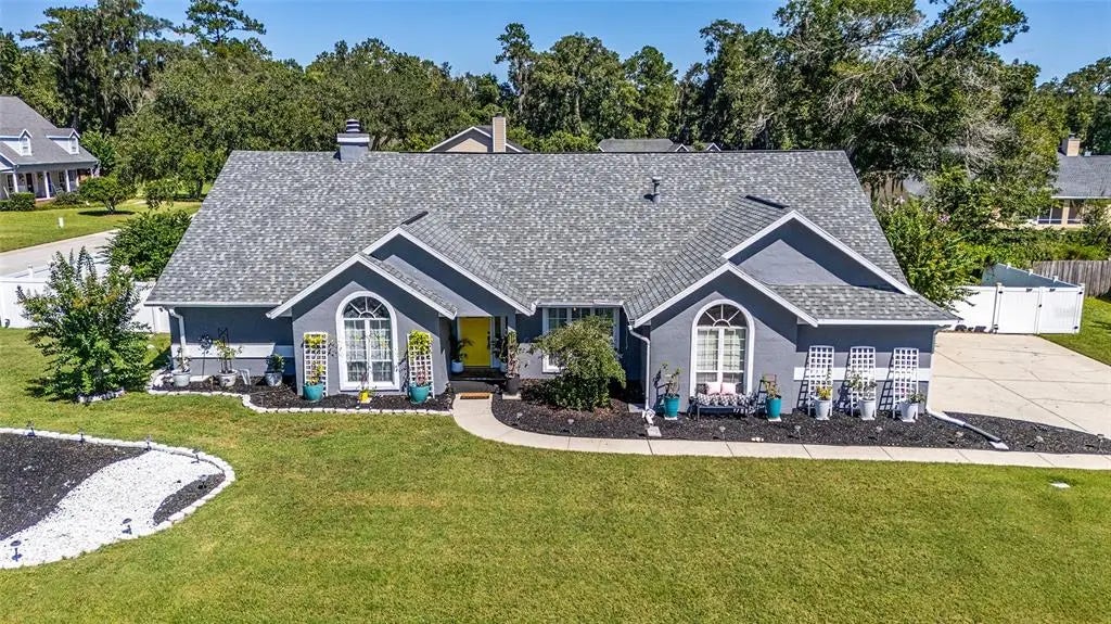 Stylish and spacious 4-bedroom, 3-bath home on a landscaped corner lot with vinyl fencing, offering both comfort and function. Inside, enjoy soaring ceilings, a decorative fireplace, and an open-concept design that flows seamlessly from the granite kitchen with double oven into the living and dining areas. A versatile bonus room makes the perfect game room, theater, or flex space, while the large dining room is currently set up as an office. The primary suite features tray ceilings, a walk-in tiled shower, makeup vanity, and a private water closet. Accessibility is thoughtfully designed with wider doors and upgraded toilets. Recent updates include a new roof, HVAC, and water heater (all 2023) plus a UV air filtration system for peace of mind. Relax year-round in the screened lanai overlooking the backyard. Beautifully maintained with hardwood beneath vinyl plank, this home blends modern updates with timeless charm.