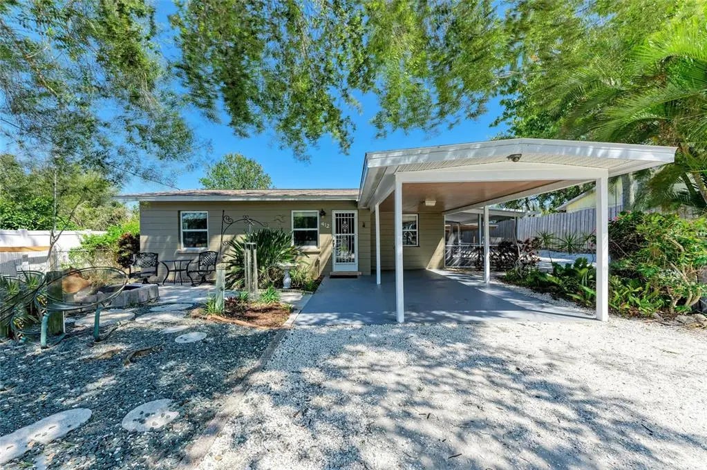 Nestled between Roberts Bay and Dona Bay, this charming home offers a prime location just minutes from the stunning Gulf beaches, the Legacy Bike and Walking Trail, shopping, and dining. Top-rated schools and a new state-of-the-art hospital are also conveniently nearby. At the end of the street, a county boat ramp provides easy access for boat and kayak launching directly into the Gulf. Best of all, this home is not in a flood zone and has remained high and dry through multiple storms and hurricanes over the years. Located in Nokomis, this well-maintained 2-bedroom, 1-bath concrete block home is connected to city water and has been cared for by the same owners for nearly 30 years. Recently painted inside and out, it features a newer roof (just 2 years old and still under warranty), providing peace of mind for years to come. With approximately 720 sq. ft. of living space under air, the home also includes an attached 120 sq. ft. screened porch for added comfort. Inside, an open-concept kitchen, living, and dining area creates a spacious feel, while a dedicated laundry space adds convenience. Decorative tile flooring extends throughout the main living areas, while both bedrooms feature wood laminate flooring and ample closet space. The full bathroom boasts a tiled tub/shower combination, vanity, and tile flooring. Additional features include ceiling fans throughout and 2-inch white faux wood blinds with coordinating valances. French doors leading from the dining area to the screened-in porch with beautiful terra cotta Saltillo tile—perfect for relaxing or entertaining. The fully fenced and gated yard offers a secure space for pets, and outdoor shower and easy-to-maintain tropical landscaping to enhance the tranquil setting. Enjoy the lush surroundings, which include banana trees, bird of paradise, areca palms, a jasmine-covered pergola, and two ornamental fish ponds. Several concrete and paver walkways lead to patios, ideal for barbecues and gatherings. For added convenience, the home provides ample parking, including a carport and additional covered and open space for a boat, motorhome, or extra vehicles. Don’t miss this opportunity to own a well-kept home in a prime location with no flood worries and plenty of outdoor space to enjoy Florida living at its best!