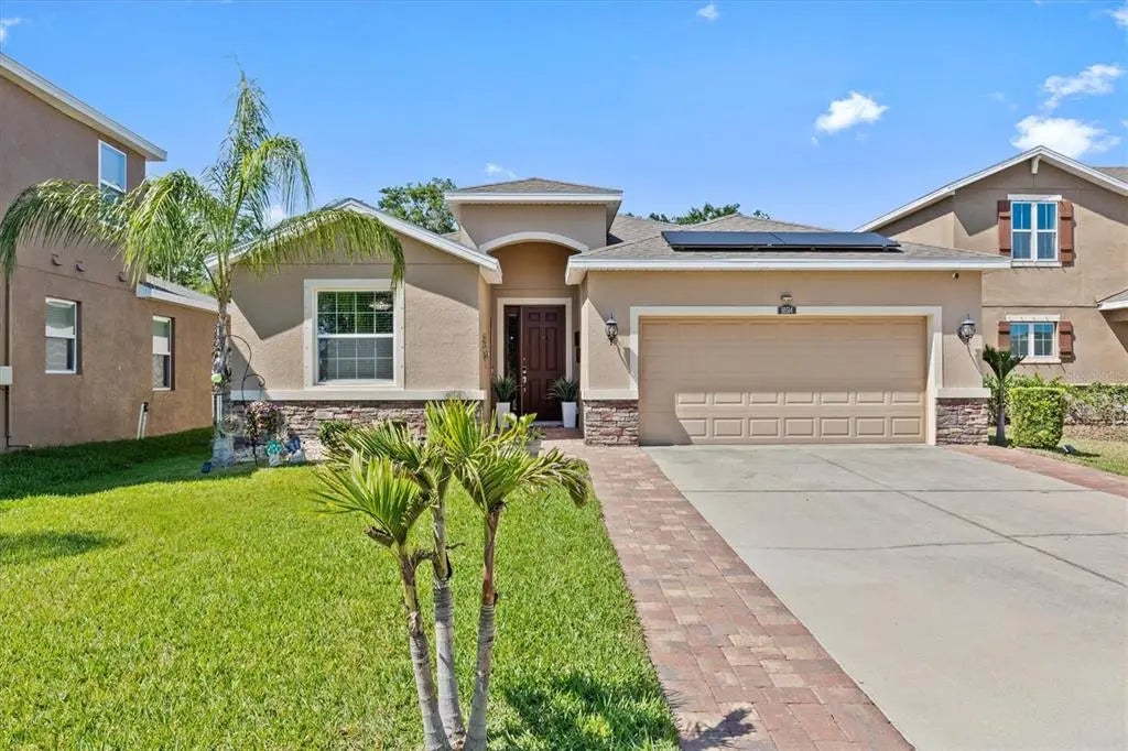 Beautifully upgraded 4-bedroom, 2.5-bath Solar home located in a prime Riverview neighborhood just minutes from US-301, I-75, shopping, hospitals, and top-rated schools. The owners thoughtfully converted the 4th bedroom into a beautiful den with French doors, perfect for a home office or lounge, but it can easily be converted back into a bedroom if needed. This home features hardwood flooring in the den and master, oversized premium tile throughout, trey ceilings, and a designer kitchen with stylish backsplash and plenty of cabinetry. The laundry room includes upgraded washer and dryer, along with built-in cabinetry for added storage and convenience. Enjoy a fully screened lanai overlooking a peaceful backyard with no rear neighbors and fruit trees including mango, papaya, banana, and lemon. Additional highlights include elevated vanity sinks, extended paver driveway, and a location just minutes from Publix, Walmart, AdventHealth, St. Joseph’s, and Riverview Math and Science Academy. Energy-efficient solar panels bring incredible savings, with the owners currently enjoying an average electric bill of only $25/month. Solar panels will be paid off in full at closing, leaving you with lasting value.