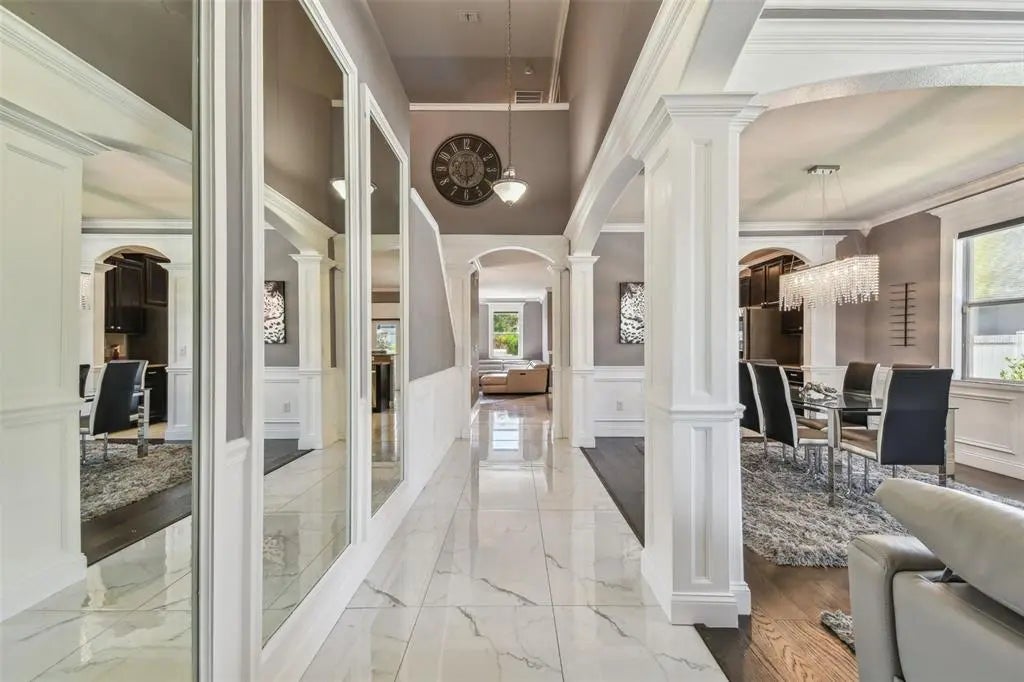 Welcome Home! This dream retreat is nestled in the highly coveted gated community of Hawks Point in Ruskin, Florida! You will not find another home in the neighborhood with the features offered that accompany this home. FEAR HURRICANE SEASON NOT! - With this brand new top of the line Metal Roof and new exterior paint and sealing. Mature landscaping with beautifully landscaped foliage and enormous towering palms trees, this house comes with serious presence as you approach it. Enjoy the oversized, elevated outdoor patio paver area and tap into the serene backyard overlooking the preserve area behind. Masterful renovations done throughout this house, when you walk in your eye will be lured into starring at the large format tile EVERYWHERE along with the warm wood floors. WOOD WORK WOOD WORK WOOD WORK! You will notice the extensive amount of time, energy and craftsmanship that was poured into the wood work around the windows, pillars and doors leading in and out of this luxurious space. Floor to ceiling large format (OVERSIZED) tile also in the downstairs and primary bathroom. Chair railing molding, beautiful wood columns, oversized CUSTOM 8 foot tall framed entry mirrors, power outlet ready for shed or backyard appliance, smart appliances and chic light fixtures throughout helping highlight the focal points in this stunner of a home! This beautifully maintained residence offers the perfect blend of comfort, style, and resort-style amenities — in a peaceful, family-friendly neighborhood just minutes from Tampa Bay. Step inside to find a spacious, open-concept floor plan featuring high ceilings, abundant natural light, and modern finishes throughout. The kitchen is a chef’s delight with granite countertops, stainless steel appliances, and a large island perfect for entertaining. The second floor owner’s suite offers a private retreat with a walk-in closet and an en-suite bath complete with dual sinks and a walk-in shower. Additional bedrooms are generously sized, ideal for guests, a home office, or growing families. Take a night with the family and experience the Theatre room upstairs! Enjoy Florida living at its best in your private backyard, or take advantage of the incredible community amenities, which include: Gated entry with 24/7 security for peace of mind Resort-style swimming pool with covered lounging areas Clubhouse with kitchen & event space — perfect for parties and gatherings State-of-the-art fitness center Playgrounds and dog parks for the whole family (including furry members!) Walking trails for active lifestyles On-site management and beautifully maintained landscaping Hawks Point is conveniently located offering easy access to Tampa, Sarasota, and award-winning Gulf beaches. Nearby shopping, dining, schools, and medical centers make this an ideal place to call home. Don't Miss Out! See it before it's gone!